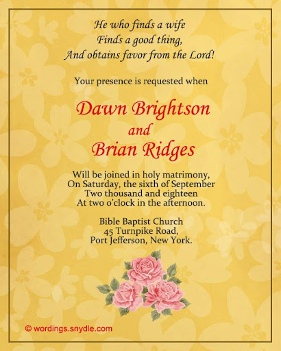 Invitations wording with bible quotes and phrases especially for Christian wedding invitations. Share this on WhatsAppFinding suitable words to use when sending out invitations can be quite a challenge but let your theme set the pace for Article by Lynne. We have the full range of customizable Christian wedding invitation wording for your guest to be present on the auspicious day.